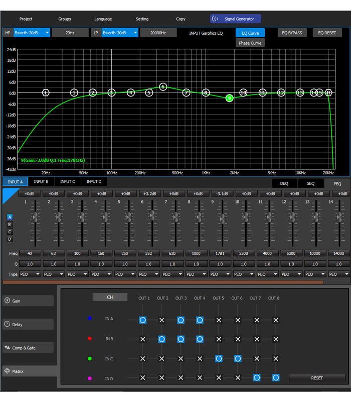 - Tiene Compresor, Delay (retardo), Ecualizador Gráfico, Ecualizador dinámico, Ecualizador paramétrico, Enrutamiento y fase, Filtro FIR, Ganancia, Generador de Señal, Limitador, Puerta de ruido, crossover