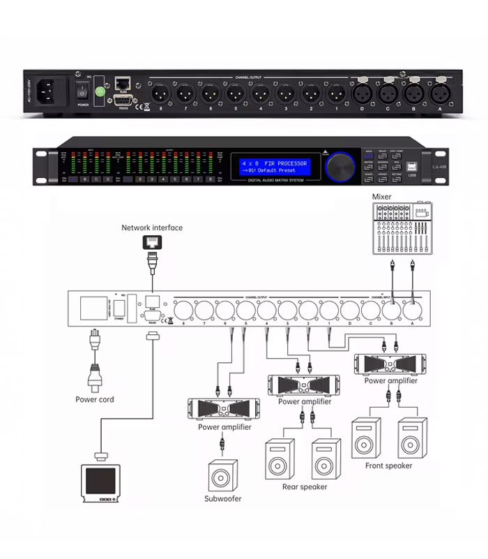 DSP LA408 – Procesador Digital de Audio Profesional 4 Entradas / 8 Salidas con USB, Red y FIR
